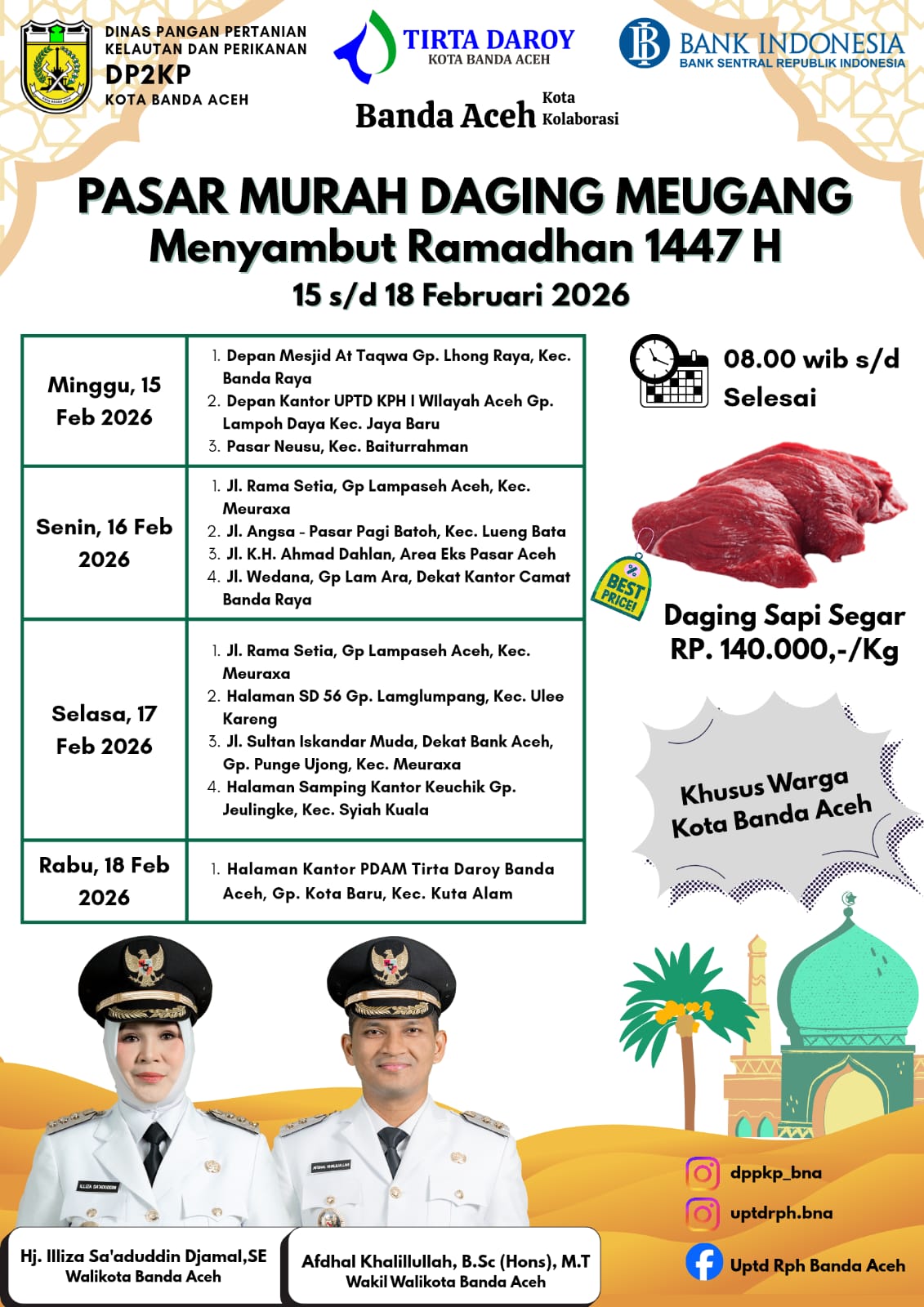 Banda Aceh – Pemerintah Kota Banda Aceh kembali menunjukkan komitmennya dalam menjaga stabilitas harga dan melindungi daya beli masyarakat melalui pelaksanaan Pasar Murah Daging Meugang menyambut Ramadhan 1447 H, yang akan digelar selama empat hari, 15 hingga 18 Februari 2026.
