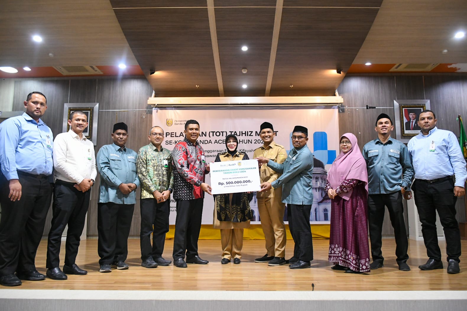 Momen penyerahan zakat tersebut berlangsung di sela kegiatan Pelatihan Tajhiz Mayit se-Kota Banda Aceh Tahun 2025 di Aula Balaikota Banda Aceh.