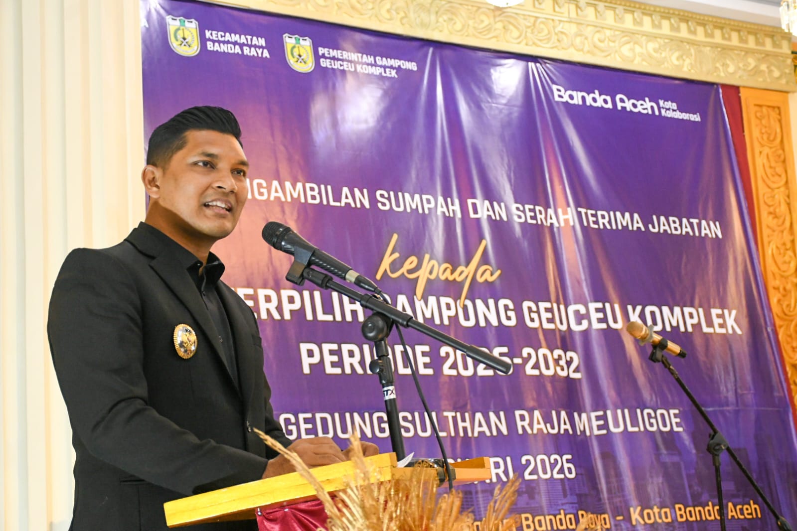 Banda Aceh – Wakil Wali Kota Banda Aceh Afdhal Khalilullah melantik sekaligus memimpin prosesi pengambilan sumpah jabatan dan serah terima jabatan Keuchik terpilih Gampong Geuceu Komplek periode 2026-2032, Asnawi Kumar.
